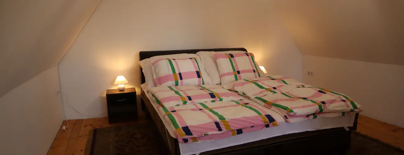 Nyáron a hűtést klíma, hidegebb évszakokban a fűtést kondenzációs kazán biztosítja. A ház max. 4 személy befogadására alkalmas. Az emeleten található egy 2 személyes franciaágy. Az alsó szinten egy kétszemélyes ággyá nyitható kanapé, TV, szekrény, kis asztal nyújt kényelmet. A konyhában gáztűzhely, mikro, kávéfőző, vízforraló, kenyérpirító, edények, poharak biztosítják a kellemes étkezést.